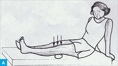발목뒤에 수건 받치고 무릎을 5초간 펴는 힘을 주고 쉬고를 반복.