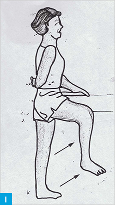 의자에 앉아 정상발로 수술쪽 다리를 구부리도록 도와준다.